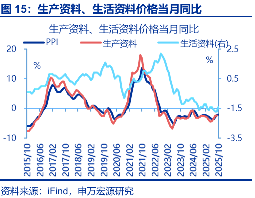 PPI同比回升,其中生活资料回升较大。10月,PPI同比录得-2.1%,与前月相比回升0.2pct。结构上,生活资料同比较前月回升0.3pct至-1.4%,而生产资料同比为-2.4%,持平上月。