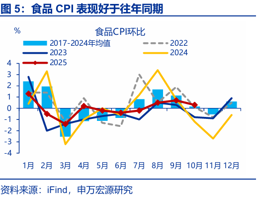 因素二:10月CPI回升至0以上,源于低基数与部分细项供给减少推升食品CPI,受反内卷影响较大的猪肉价格仍在低位。10月CPI环比0.2%,略高于2017年以来的均值(0.15%);CPI同比较前月上行0.5pct至0.2%。结构上低基数下,食品同比上行1.5pct至-2.9%。其中鲜菜、鲜果CPI同比分别上行6.4、2.2pct;且供给减少下,其CPI好于往年同期。相比之下,受反内卷影响较大的猪肉价格仍维持低位,猪肉CPI同比为-16%。