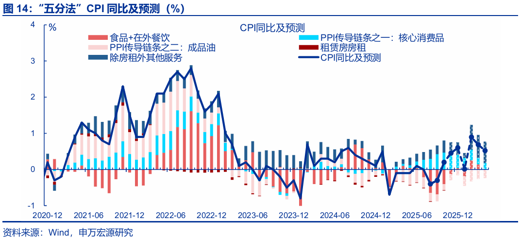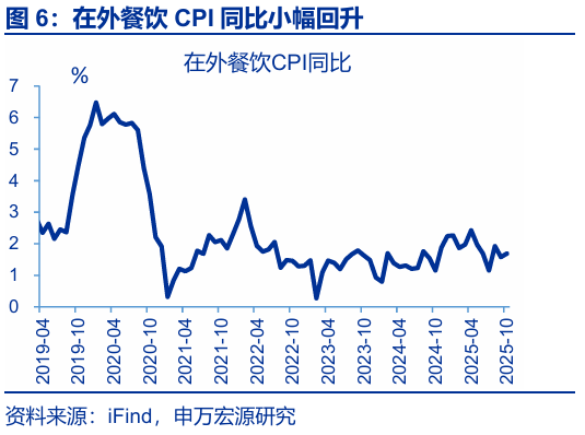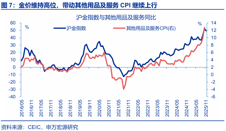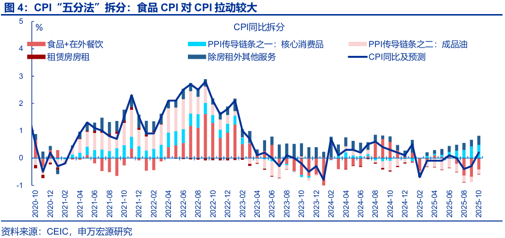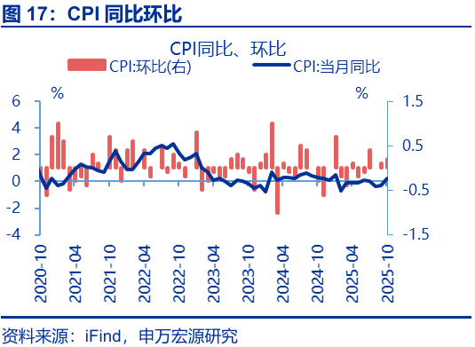 因素三:核心CPI继续回升,更多是出行需求改善及金价上涨的支撑。10月,核心CPI同比上行至1.2%。拆分结构看,核心服务CPI整体(环比0.3%)明显好于季节性,主因国庆、中秋双节叠加,出行需求较旺,宾馆住宿、飞机票和旅游价格分别上涨8.6%、4.5%和2.5%,同时统计在食品中的在外餐饮CPI也有改善(同比+0.1pct至1.7%)。而青年失业率仍在高位下,租房需求较弱令10月房租CPI(环比0.1%)不及往年同期(0.3%)。核心商品CPI同比上行0.2pct至1.6%,更多来自金价上涨的支撑。10月中下旬金价有所回落,但全月仍呈上涨态势,继续支撑国内金饰品和铂金饰品价格(同比分别50.3%、46.1%)。
