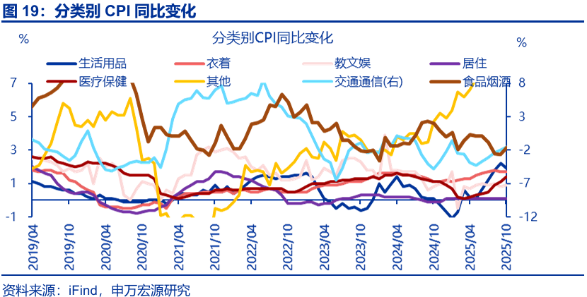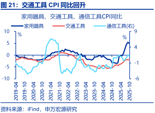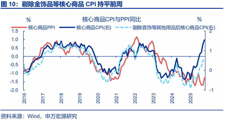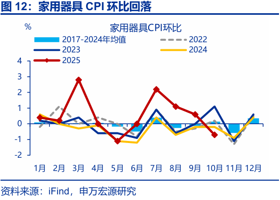 剔除金饰品后的其余核心商品CPI未继续上涨,可能受商家平滑补贴节奏调整的影响。剔除金饰品等价格的影响后,核心商品CPI未继续上涨,同比持平于0.5%。部分地区国补于9月中下旬集中暂停,企业可能为平滑补贴节奏,于9月集中销售国补商品(9月下旬汽车等国补商品零售明显冲高),商家补贴则腾挪至四季度;客观导致9月国补商品占比冲高,10月有所回落。譬如家电CPI在9月上行至5.5%后、10月回落至5%。(国补CPI核算补贴前价格,商补CPI核算补贴后价格)。