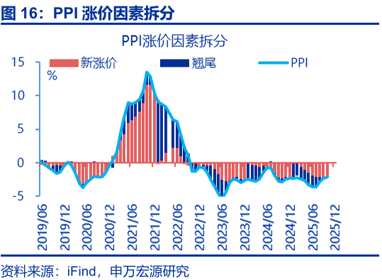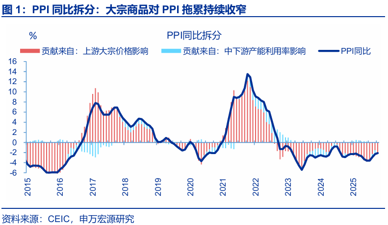 因素一:10月反内卷推动煤价上涨但对中下游PPI提振较小,且受反内卷影响较小的铜价涨幅较大。10月PPI环比0.1%,同比较前月回升0.2pct至-2.1%。从影响因素看,10月以来,铜价涨幅较大(环比7%),相应有色采选、有色压延业价格环比分别5.3%、2.4%,拉动PPI环比0.2%,为主要贡献项。反内卷推动煤价也有较大上涨(环比7.5%),煤炭采选、煤炭加工业价格环比分别1.6%、0.8%,拉动PPI环比0.1%;但钢价回落,令黑色压延等行业PPI环比为负。中下游产能利用率也未有明显改善,导致中下游价格无法充分反映上游涨价传导,测算该因素拖累PPI环比-0.06%。具体行业看,医药、汽车等行业PPI环比均为-0.2%。