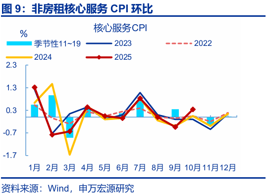 服务CPI:整体服务CPI有所回升,核心服务CPI好于季节性。10月,整体服务CPI同比边际上行0.2pct至0.8%。其中核心服务CPI环比0.3%、好于季节性(0.1%)。