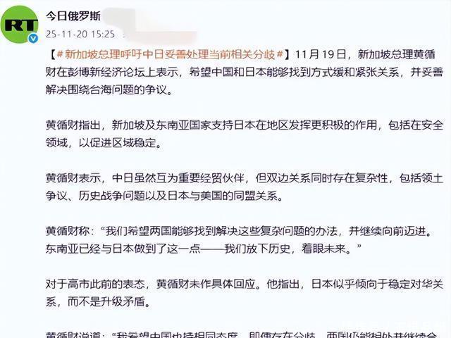 编辑|小Z 前言 当地时间11月19日,新加坡总理黄循财在彭博新经济论坛上谈到最近的中日紧张关系。 他认为,日本更希望关系稳定,而不是让矛盾继续升级,同时也希望中国能做出类似选择,在分歧中继续合作、相互处事。 按说第三方劝和是好事,但仔细看他说的话,多少有点替日本说话的意思。